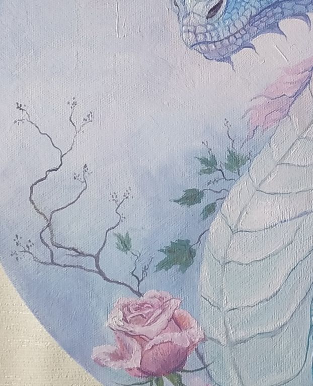 Пастельные тона, еле заметная улыбка на пасти дракона, нежный и внимательный взгляд, розы окутывающие дракона делают картину "Дракон с розами" источником умиления и теплоты. Картина послужит замечательным подарком в 2024 году, который не будет забыт и не останется без внмания в последующие годы.
