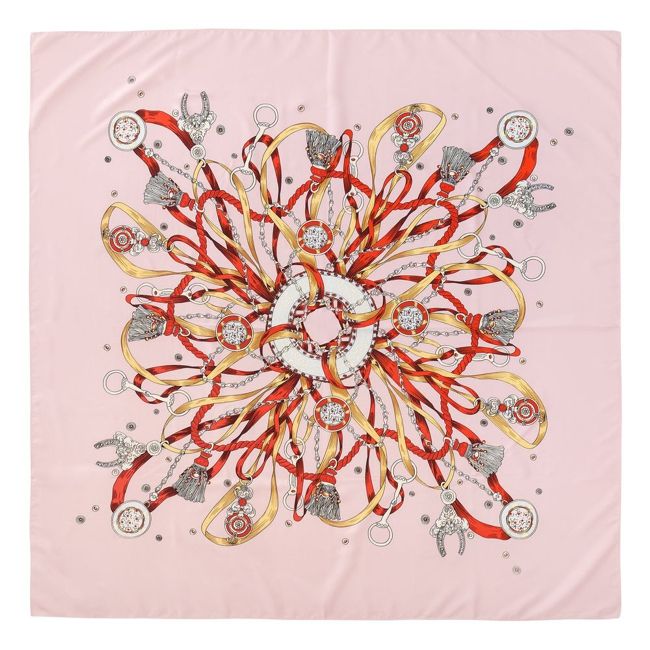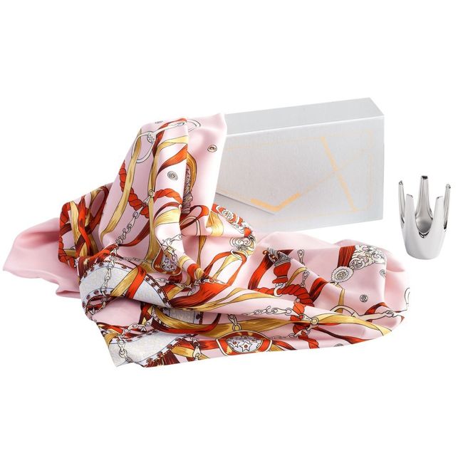 - материал: платок - шелк с добавлением полиэстера(саржевое переплетение, трафаретная печать с прорисовкой отдельных элементов вручную, плотность платка: 85 г/м², края обработаны горячей резкой и не осыпаются), подставка для колец никелированная сталь с зеркальной поверхностью;